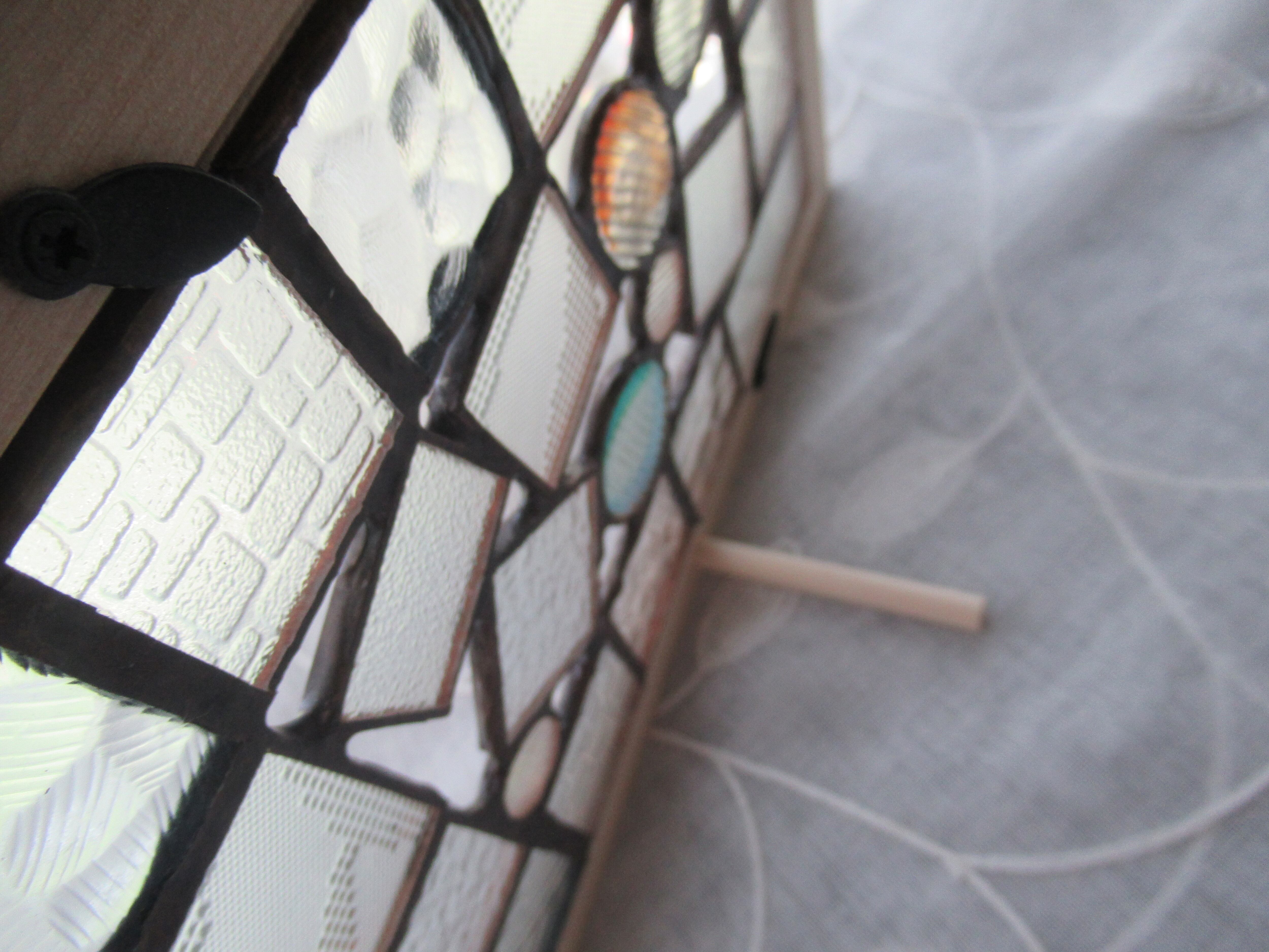 ※ハンダ部分は、腐食防止の防サビ保護の効果があるポリワックスで磨いていますが、ステンドグラス特有の白っぽい錆が発生することがあります。アンティークな風合いを楽しめますが、気になる方は再度ポリワックスで拭くときれいになります。