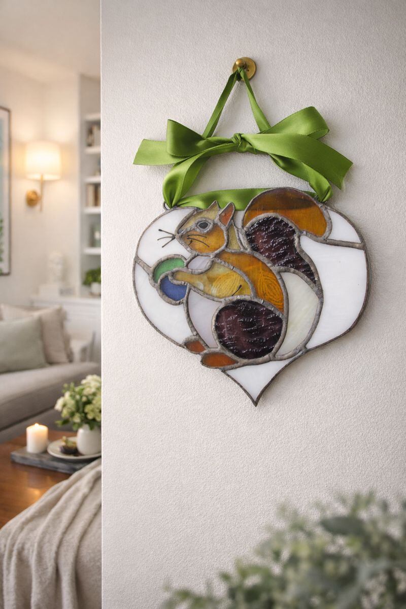 このステンドグラスは、リビングや寝室にぴったりのアイテムです。リスのかわいさが、お部屋を明るくし、心に安らぎをもたらします。また、カフェやギャラリーの装飾としても最適で、訪れる人々に癒しの空間を提供します。