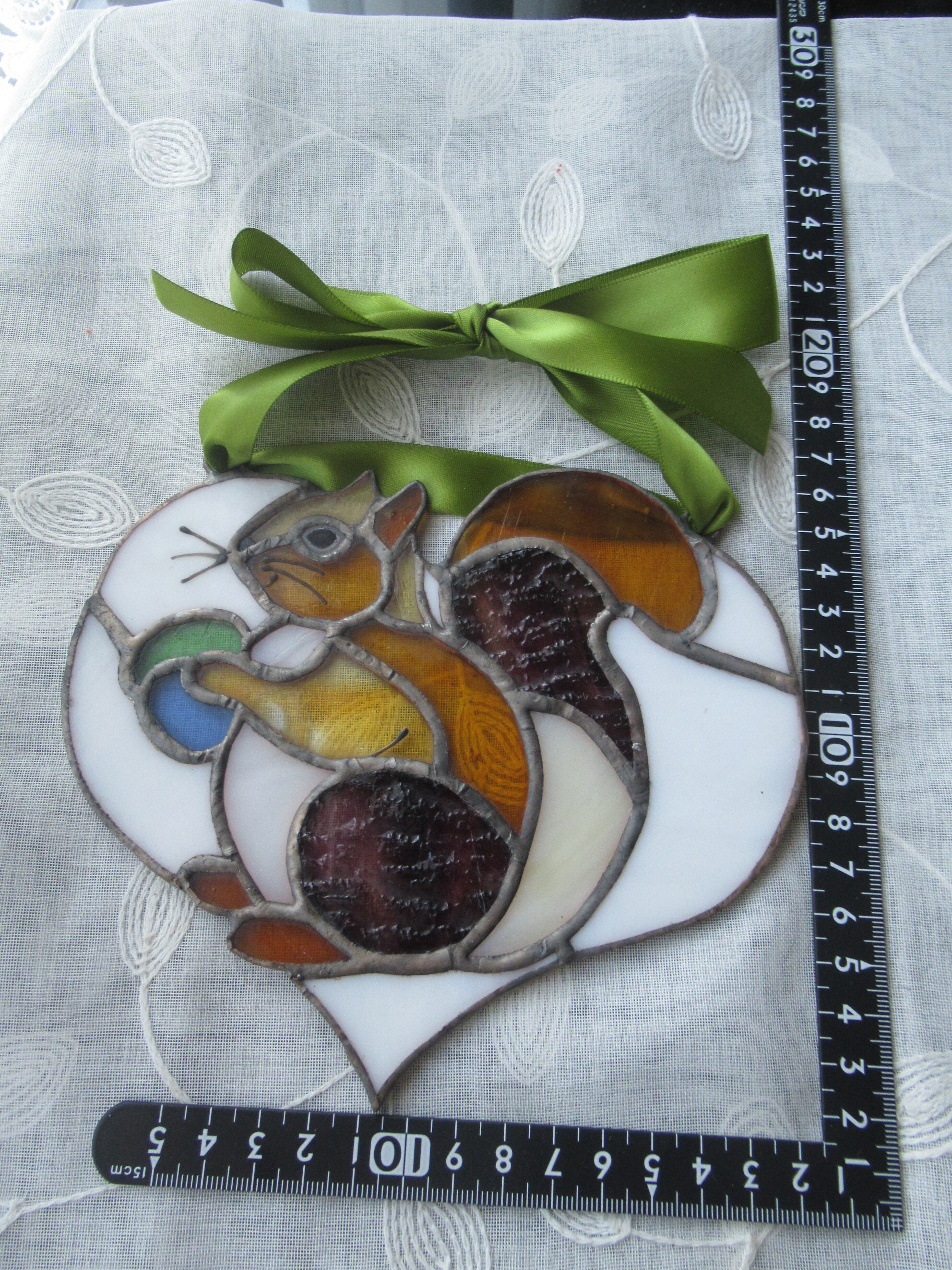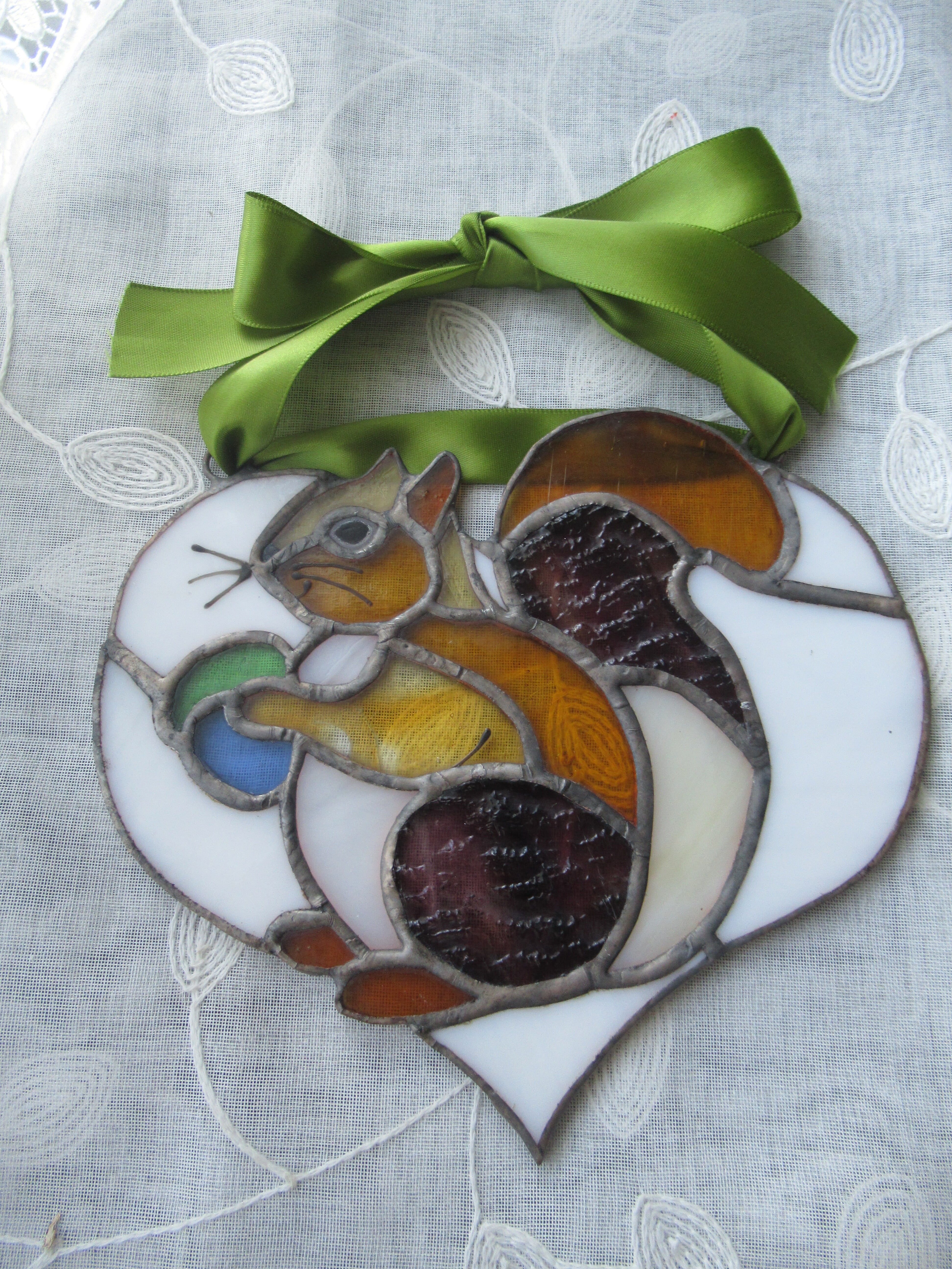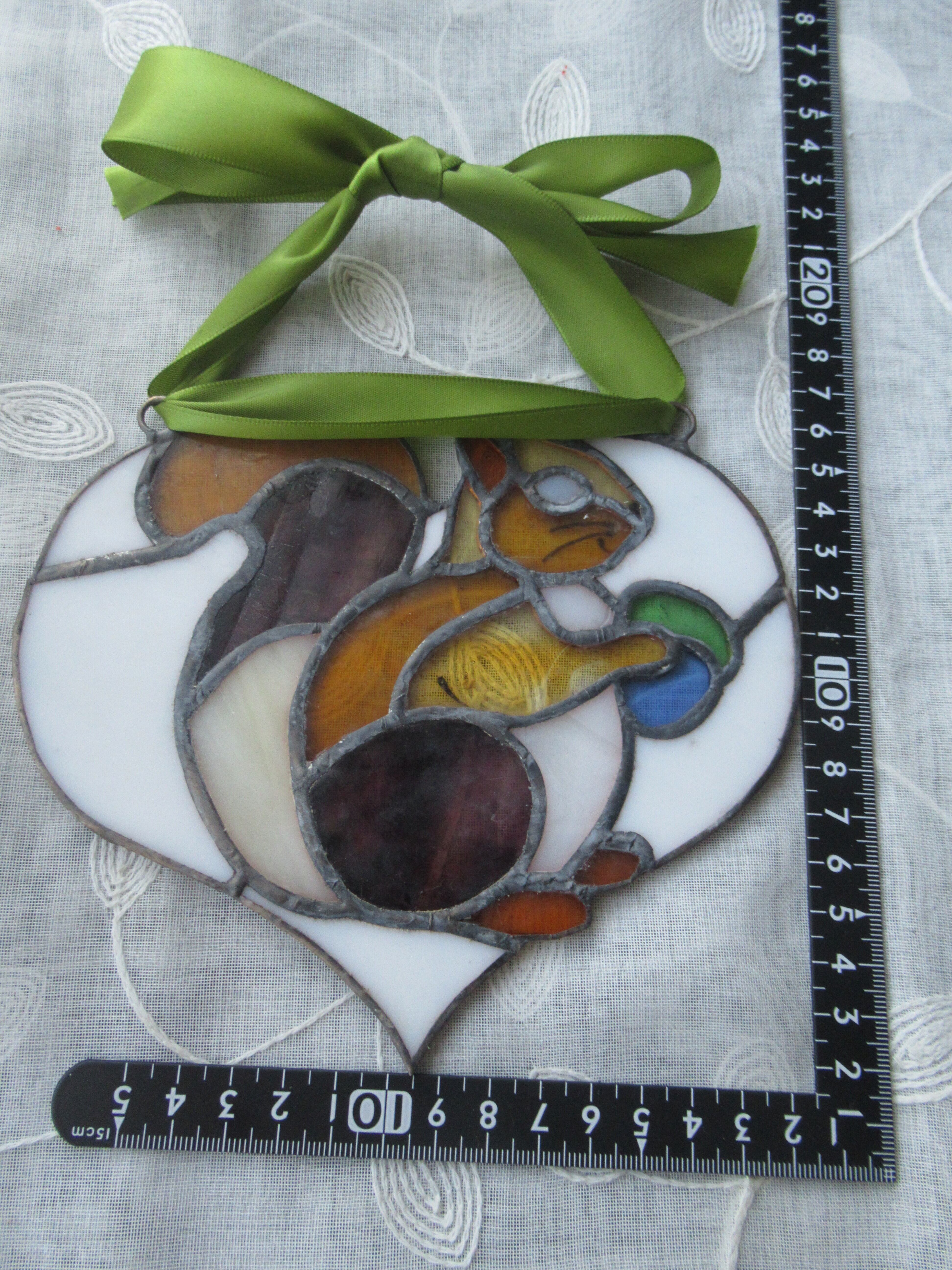 愛らしいリスをモチーフにしたハート型のステンドグラスは、見る人の心をつかむデザインが特徴です。黒い目や髭は焼き付け加工されており、表情豊かで温かみが感じられます。光が当たると、リスの姿が華やかに浮かび上がり、幻想的な影をお部屋に投影します。